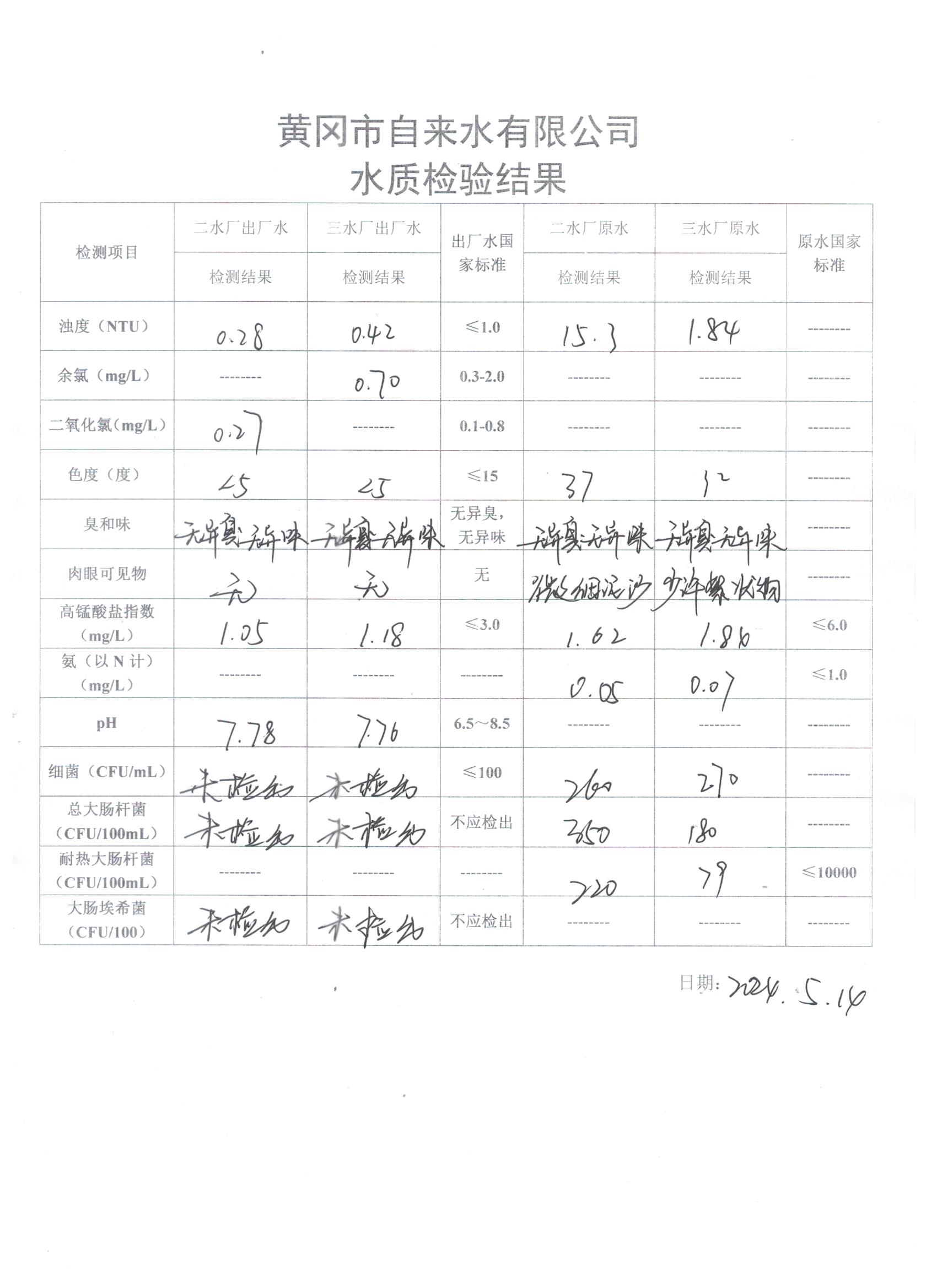 2024年5月14日水質(zhì)檢驗日報表