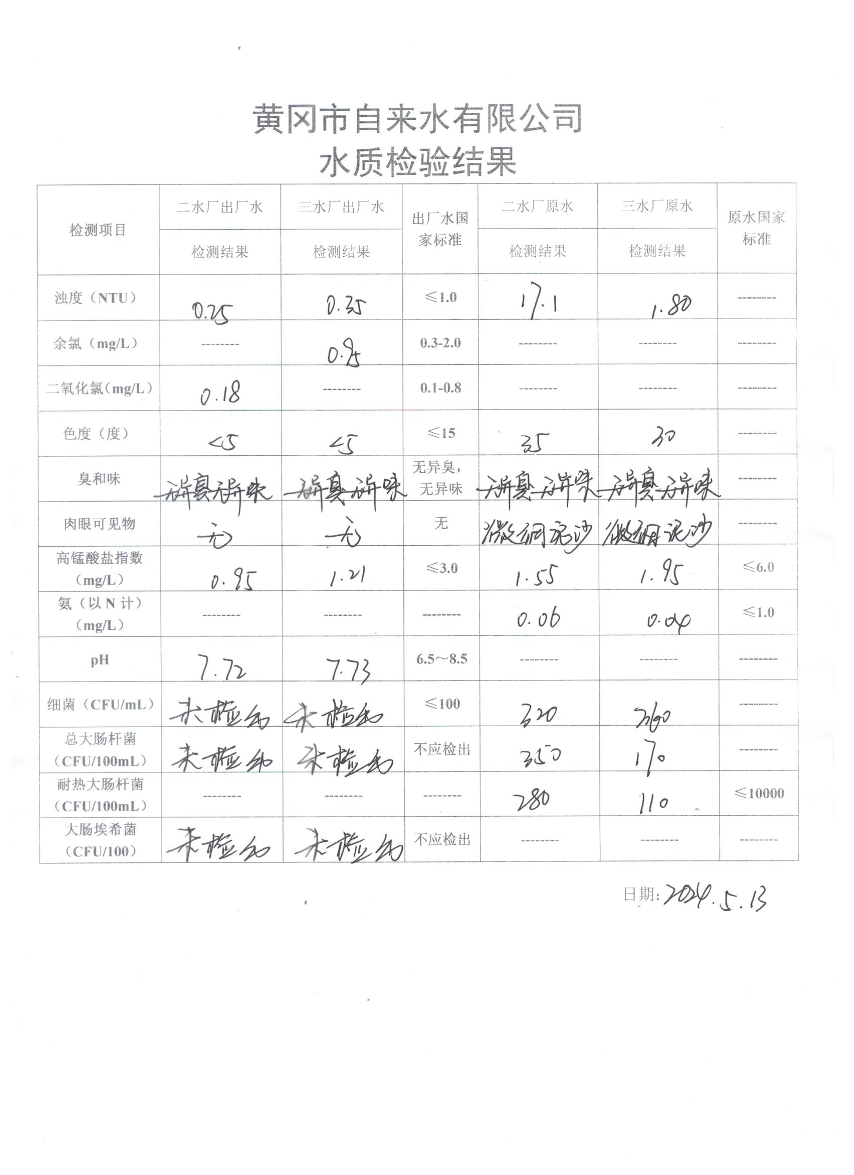 2024年5月13日水質(zhì)檢驗日報表