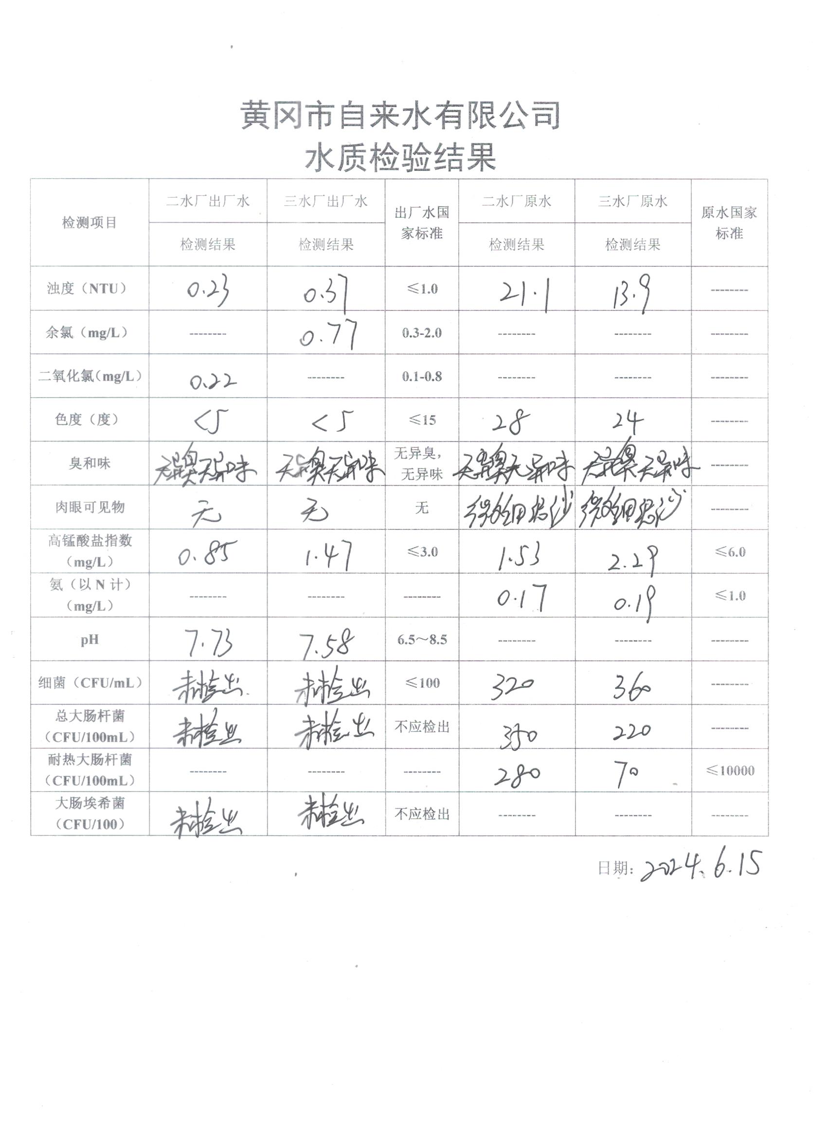2024年6月15日水質檢驗日報表