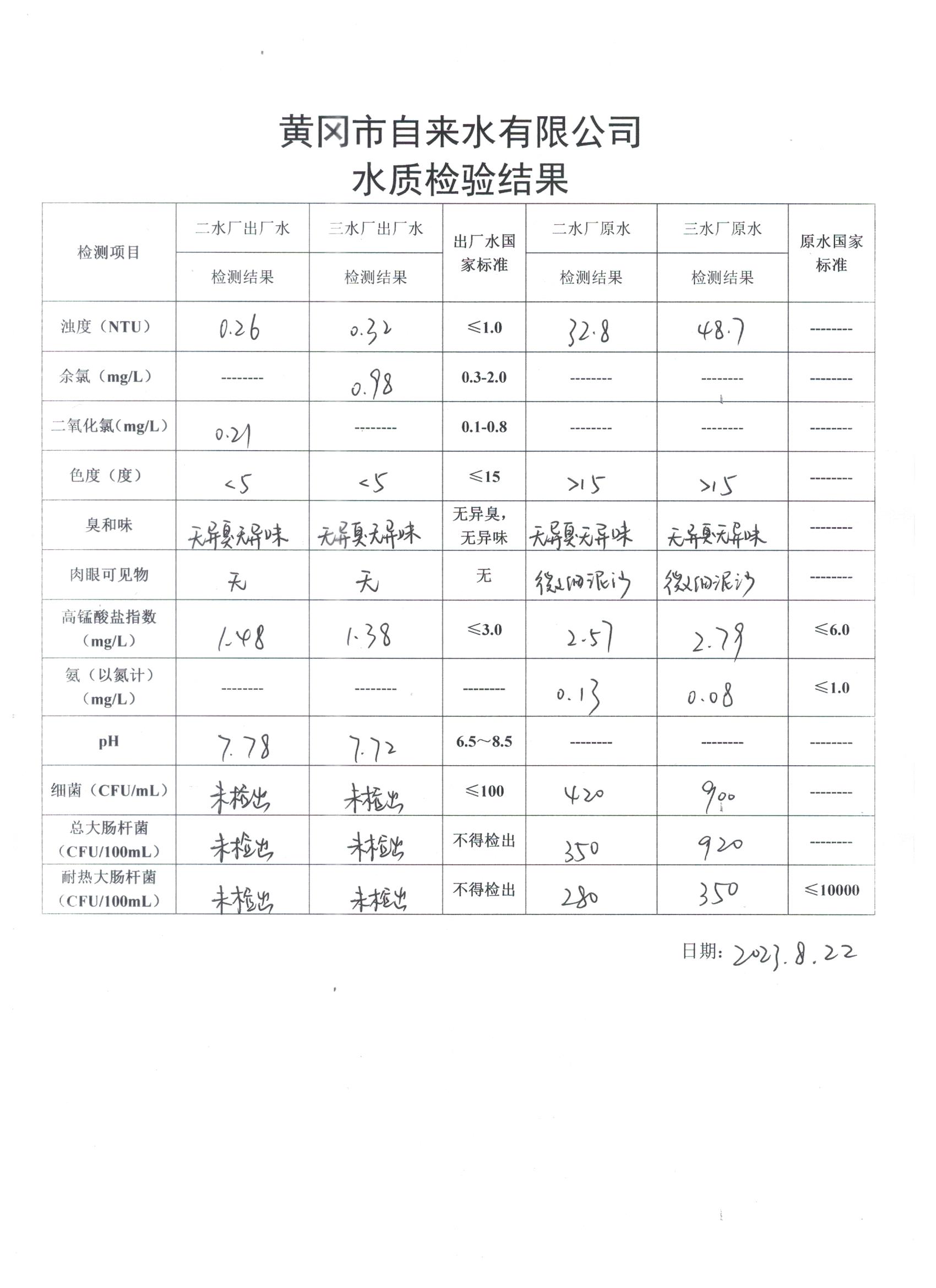 2023年8月22日水質(zhì)檢驗(yàn)日報(bào)表