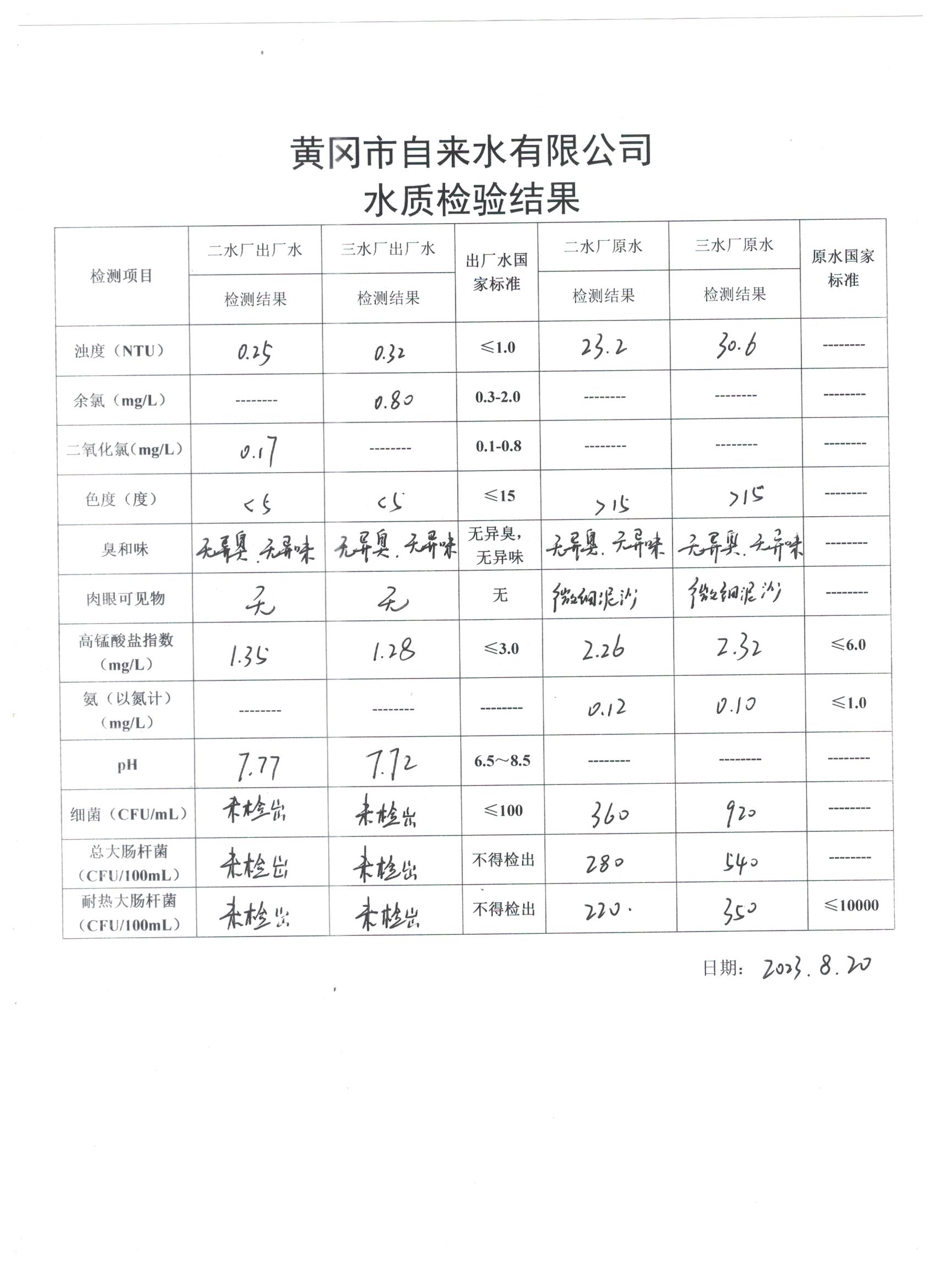 2023年8月20日水質(zhì)檢驗(yàn)日?qǐng)?bào)表