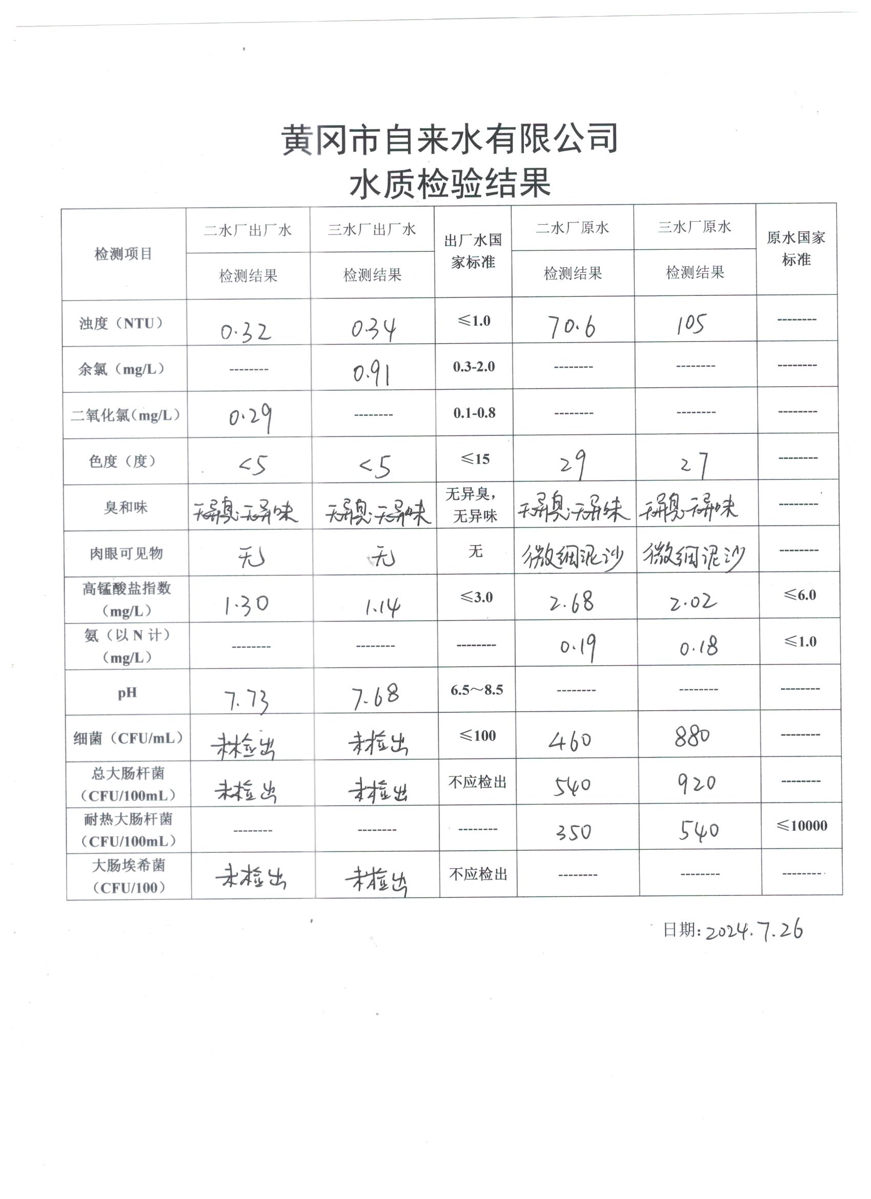 2024年7月26日水質(zhì)檢測日報(bào)表