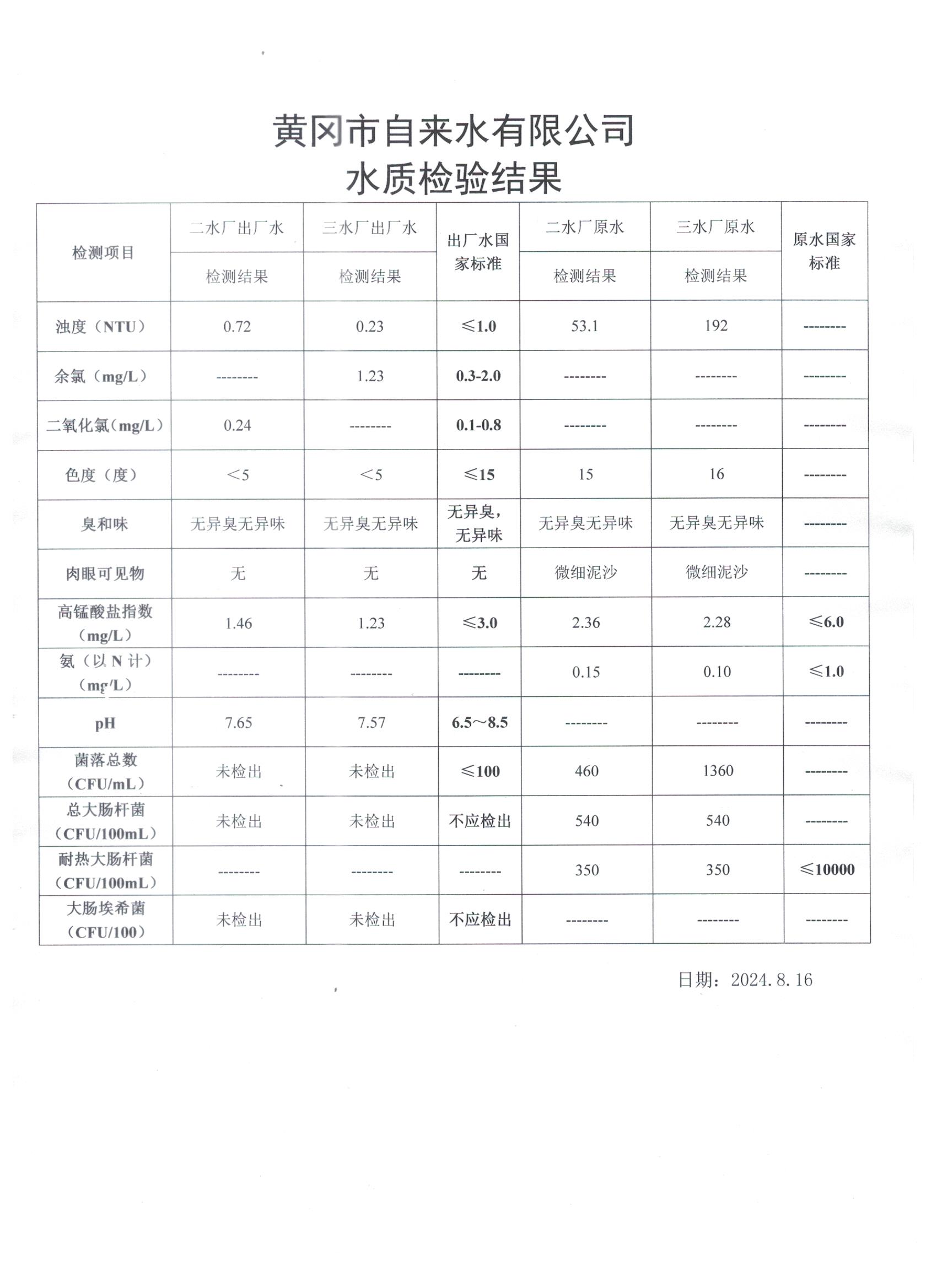 2024年8月16日水質(zhì)檢測(cè)日?qǐng)?bào)表