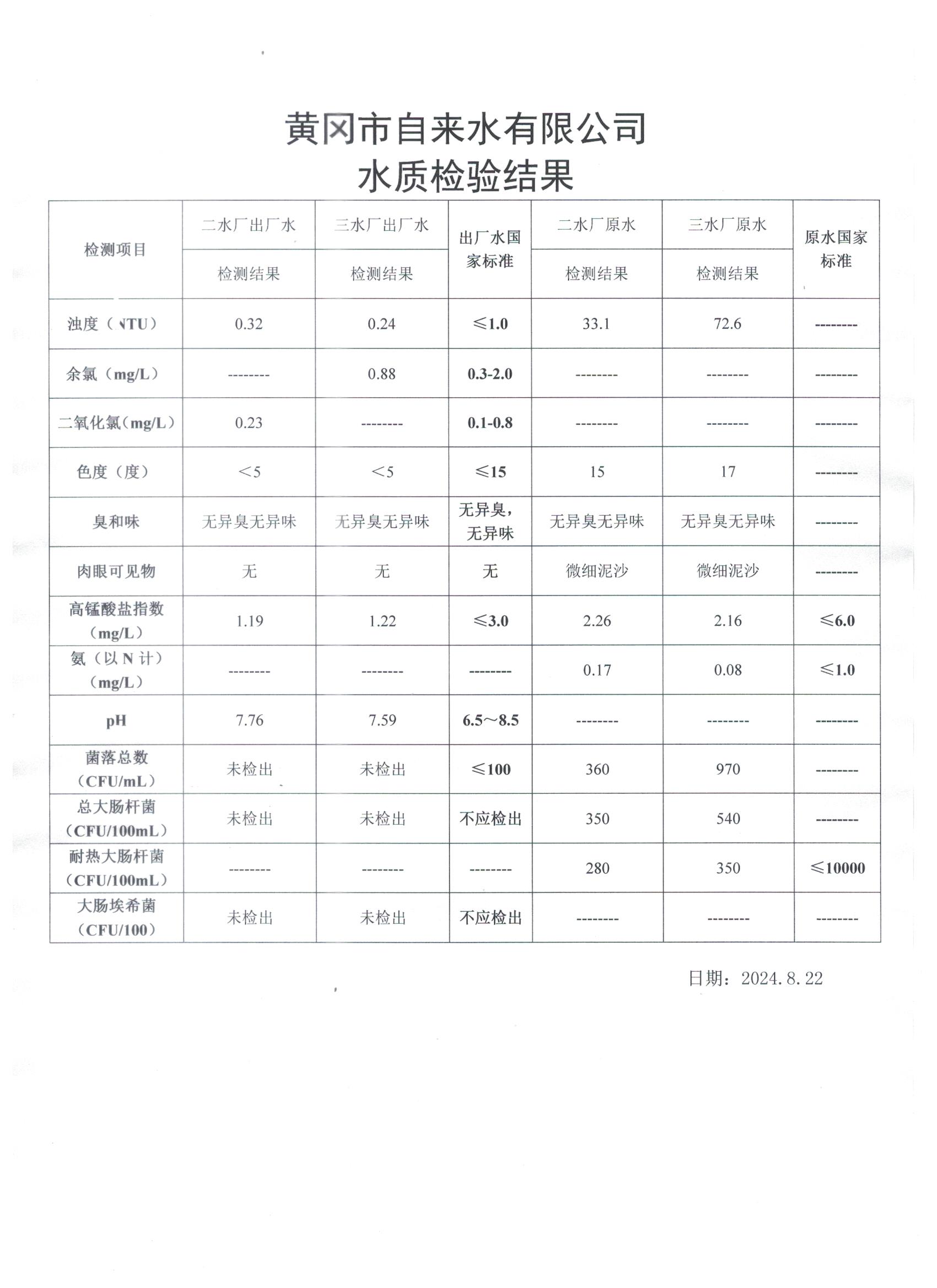 2024年8月22日水質(zhì)檢測(cè)日?qǐng)?bào)表