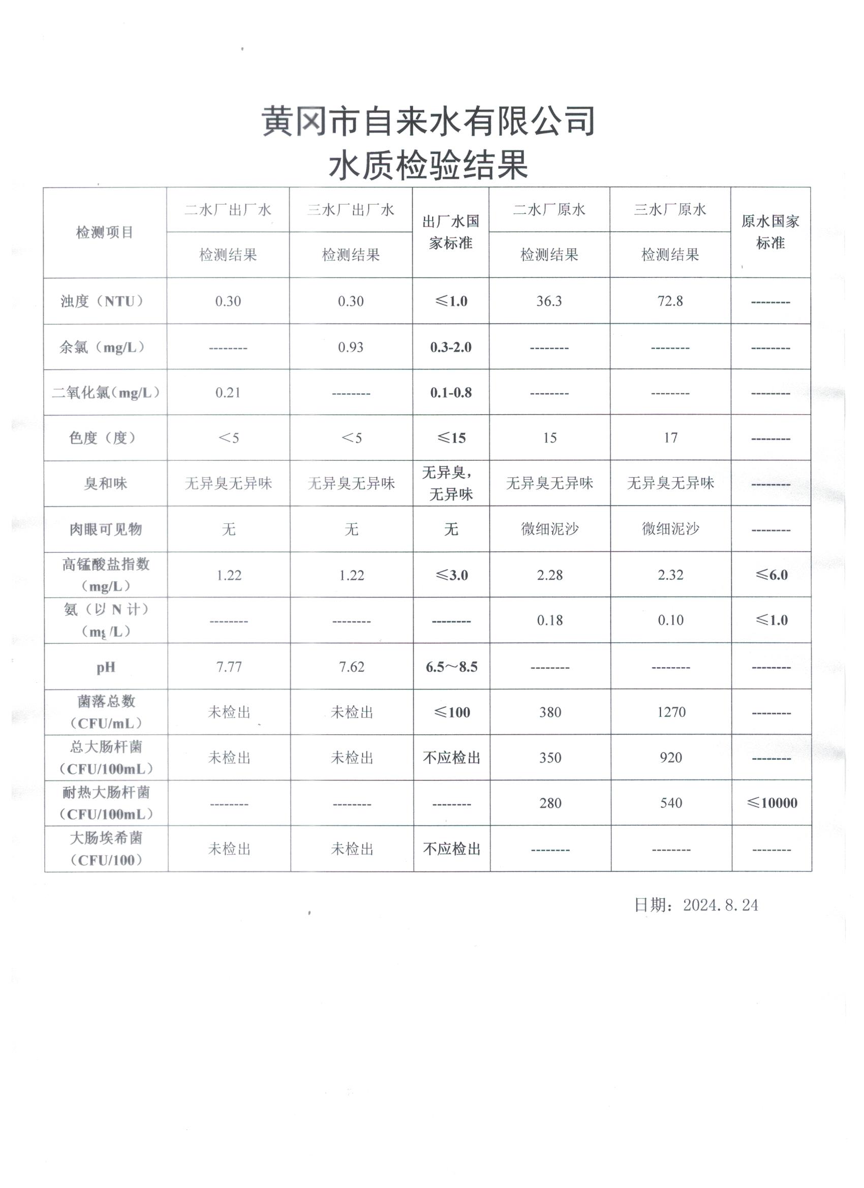2024年8月24日水質(zhì)檢測(cè)日?qǐng)?bào)表