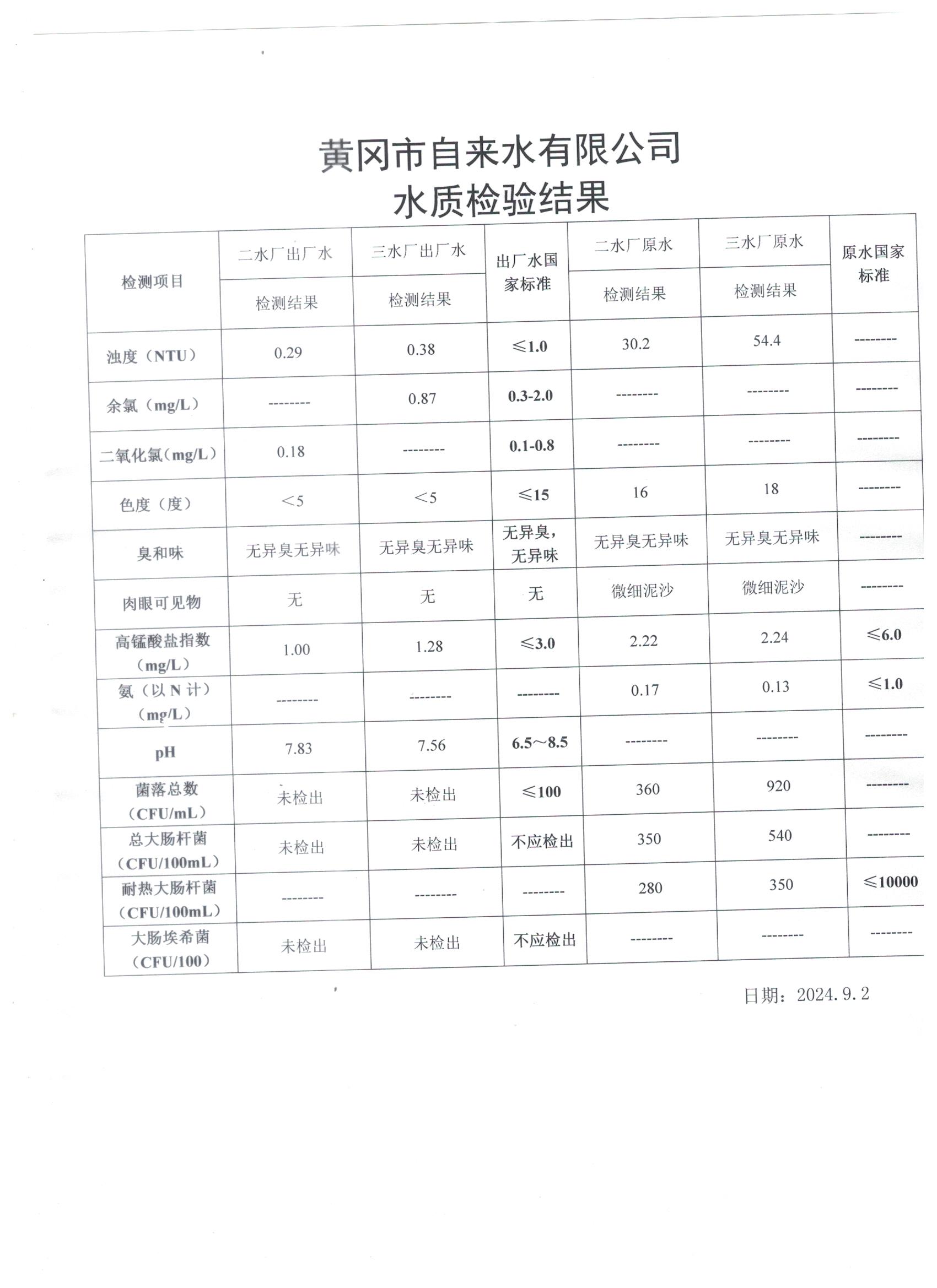 2024年9月2日水質(zhì)檢測日報表