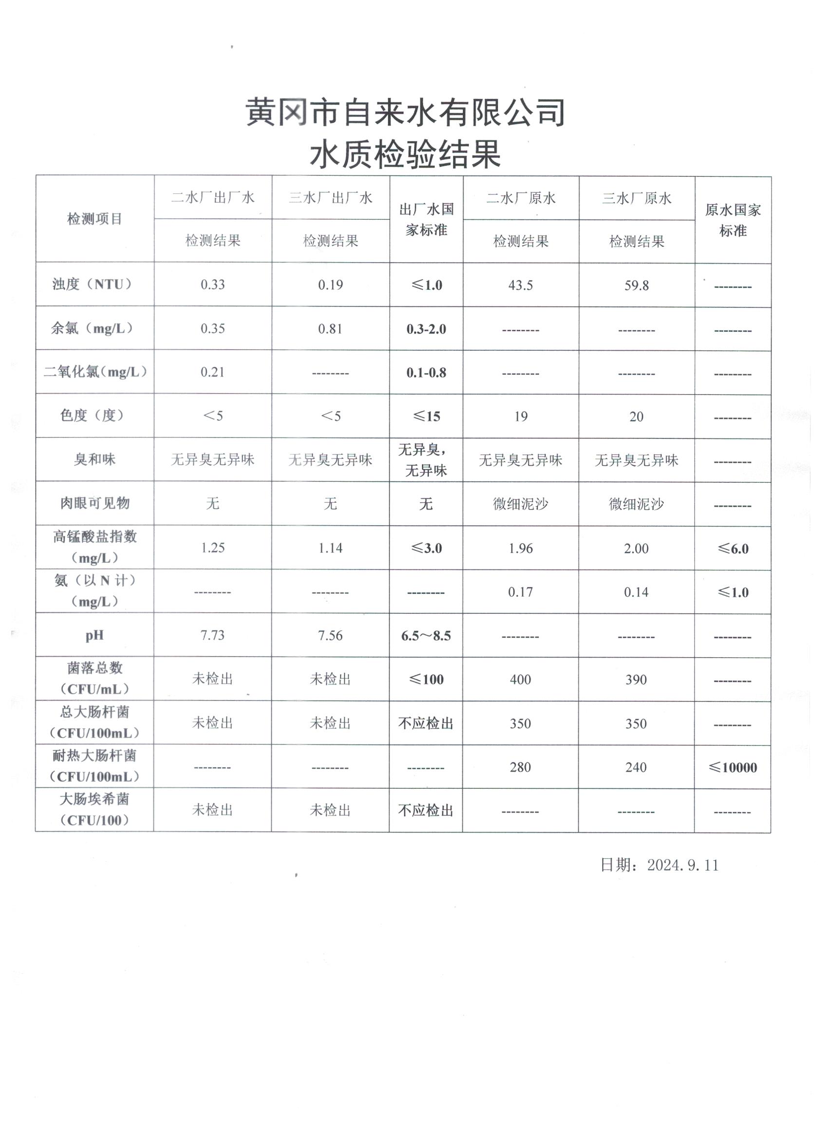 2024年9月11日水質(zhì)檢測日報表