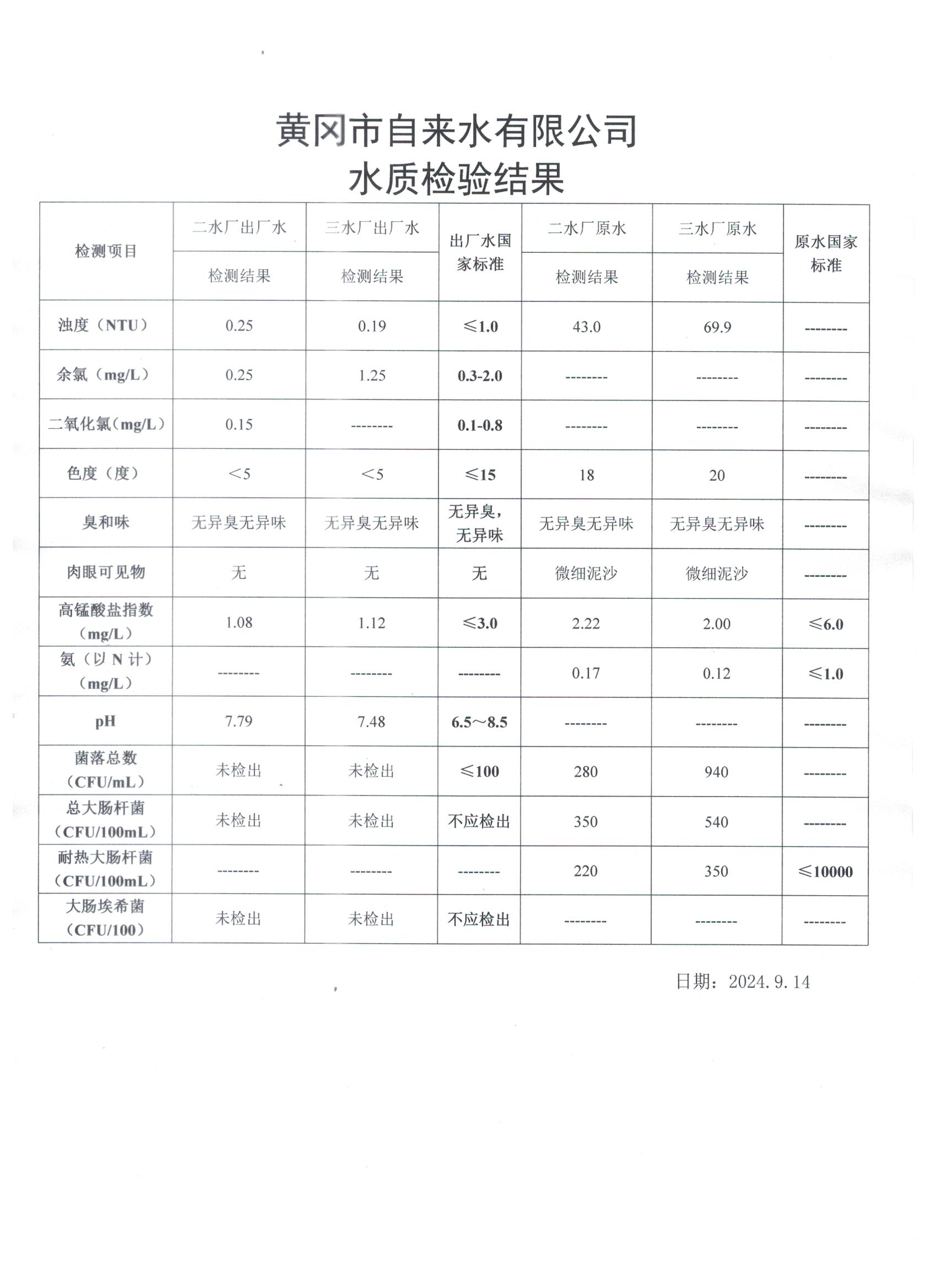 2024年9月14日水質(zhì)檢測日報表